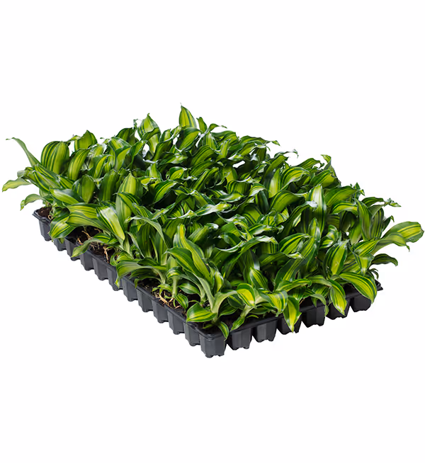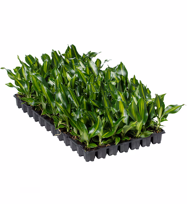 Dracaena fragrans Burley is a stunning broadleaf shrub. In its natural habitat, it produces fragrant flowers; hence its botanical name. As a decorative houseplant, the most stunning feature is its spirally arranged leaves. Dracaena Burley has long, pointy, arching leaves with a striking, olive green centre stripe and dark green margins. Dracaena fragrans is native to tropical parts of Africa, where it grows as an evergreen perennial in upland regions and damp, tropical forests. Dracaena fragrans Burley is a spectacular statement plant and well-suited to light up shady spots in a room or office. As a bonus, Dracaena is one of the best air purifiers. Aside from its distinctive leaf colour and pattern, Dracaena fragrans Burley is selected for being tough and resilient. It’s easy-to-grow and tolerant to a wide range of climate conditions. Dracaena fragrans Burley is commonly known as Sweet-scented dracaena or Corn plant. Other internationally used common names for Dracaena fragrans are: Cornstalk plant; Cornstalk Dracaena; Dracena Fragrans; Corn Palm; Palmillo; Fortune Plant; Senjuang Wangi; Dragon Plant; Iron Plant. Evanthia has Dracaena fragrans Burley starting material available all year round, as tissue culture young plants. Ask our team for the Dracaena cultivation manual for commercial production. Check out all Dracaenas in the Evanthia range.