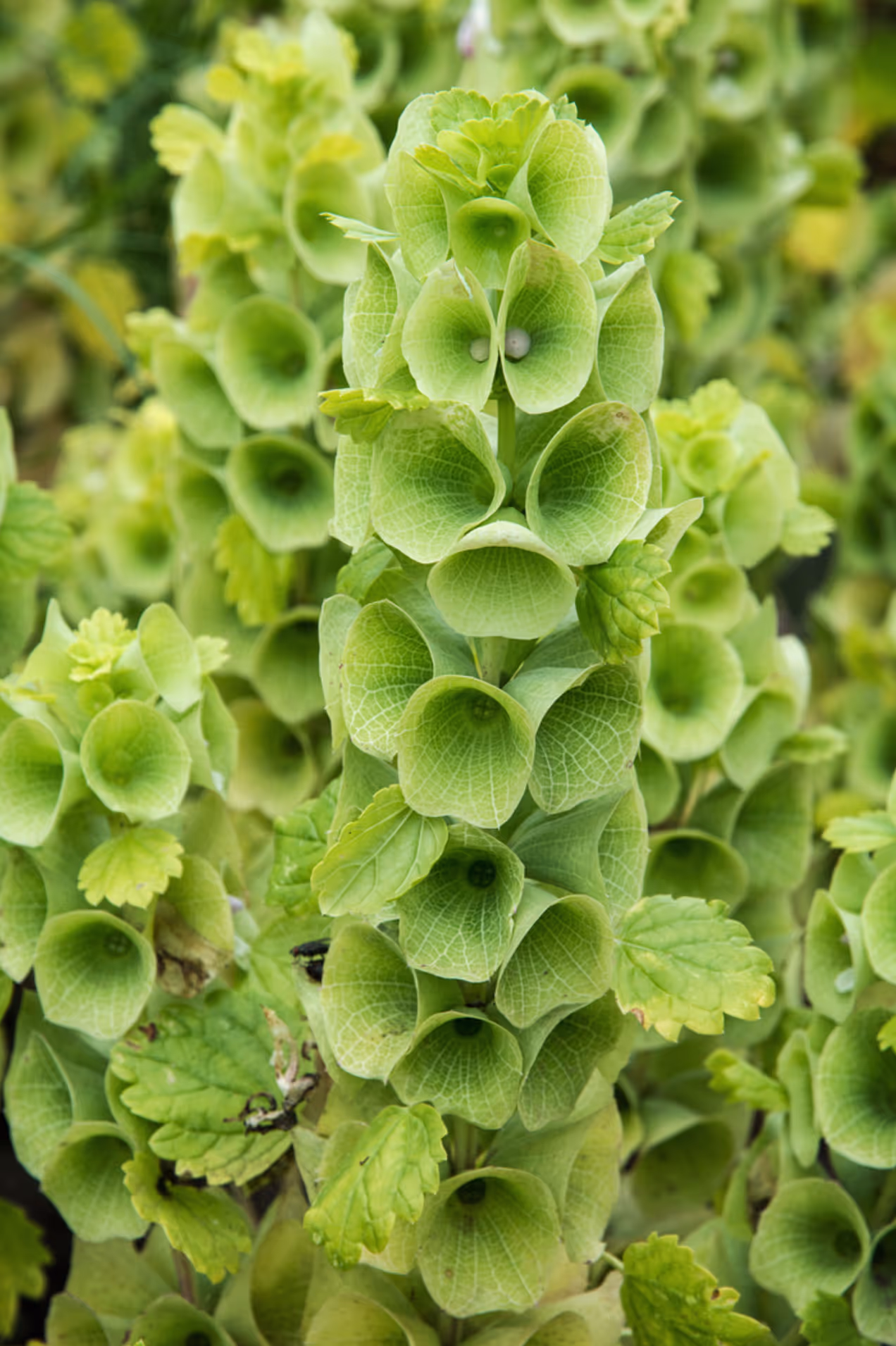Molucella Bells of Ireland is a stunning cut flower with green spikes and bell-shaped calyces.
