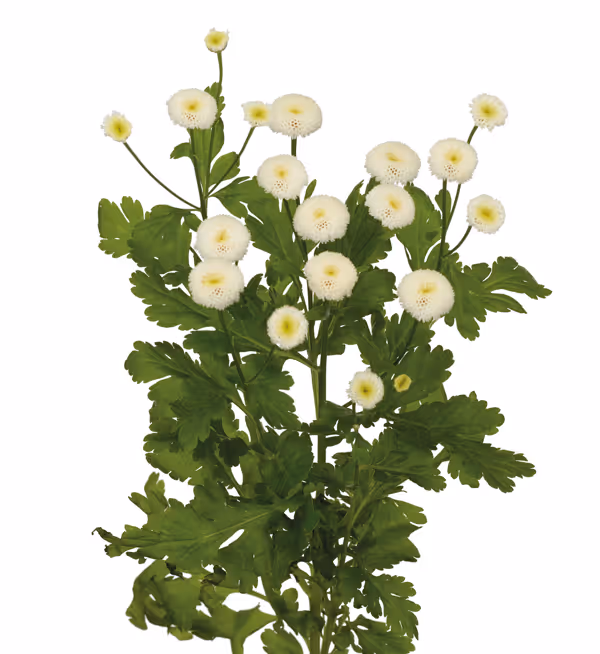 Tanacetum Rio is a radiant white Tanacetum with well-filled semi-circular flowers. Tanacetum Rio has relatively tall stems and can be cultivated all year round in the greenhouse. This trendy bouquet filler brings volume thanks to good branching and rich flowering.
